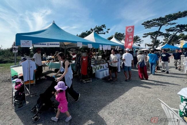 BOWさんに「良い旅を」と告げて向かったのは、すぐ近くの森戸神社です。この日は神社の駐車場で「ビッグハヤマ・マーケット」というイベントをやっていました。葉山町商工会が主催で、「ここでしか味わえない葉山町の魅力を存分に活かした地域の産業や文化をPRし、地域住民や訪れる方々に葉山の良さを伝える、温かくて活気に満ちたイベント」だそうです。