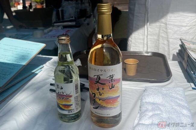 歩いて入ると、まずは夏みかんのワインとサイダーの試飲があります。1959年に御用邸のある葉山町に、上皇御夫妻の御成婚記念で夏みかんの苗が配布されたことがあり、たくさんの家の庭に夏みかんの木があります。この夏みかんを使ったワインとサイダーを町の名産としてもっとアピールしたいと「葉山夏みかんプロジェクト」が出展していました。サイダーを試飲してみると、夏みかんの風味が濃く、甘すぎずサッパリとした美味しさでした。