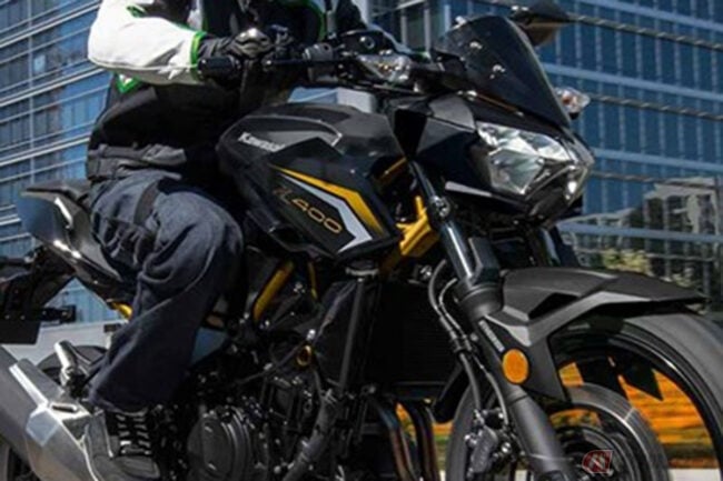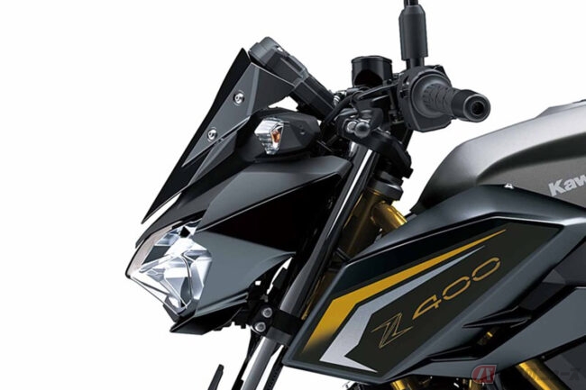 ビギナーからベテランまで楽しめる扱いやすい特性のZ400は、大型モデルの「Z」シリーズで提唱した先鋭的な車体形状の「Sugomi」デザイン(クラウンチングフォルム、低く構えたヘッドライトフェイス、跳ね上げられたテールセクション)を踏襲。