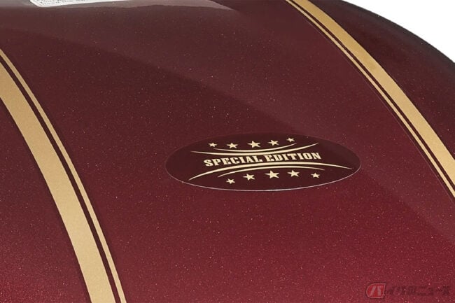 ハイネスCB350や派生モデルの「CB350RS」(日本モデル名:GB350S)とは異なり、キャブトンタイプのマフラーを備えることでクラシカルな雰囲気に拍車をかけるCB350CのSPECIAL EDITIONでは、前後のフェンダーやタンク、サイドカバーにストライプを施した上で、タンク上部に特別仕様であることを示すデカールを配置。