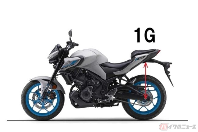 次に、車体を地面の上に立て、車体の重量のみでサスペンションが縮んでいる状態を「1G(ワン・ジー)」と呼びます。
