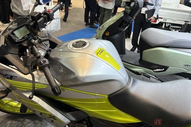 5月21日から23日にかけて開催された「人とくるまのテクノロジー展」で日本初公開されたジクサーSF250 FFVは、日本にも導入されているジクサーSF250をベースに、インジェクターや燃料ポンプ、エンジン制御等を改良することで、トウモロコシやサトウキビから作られるバイオエタノール85%までの混合燃料を使用出来るフレックス燃料車(FFV)です。