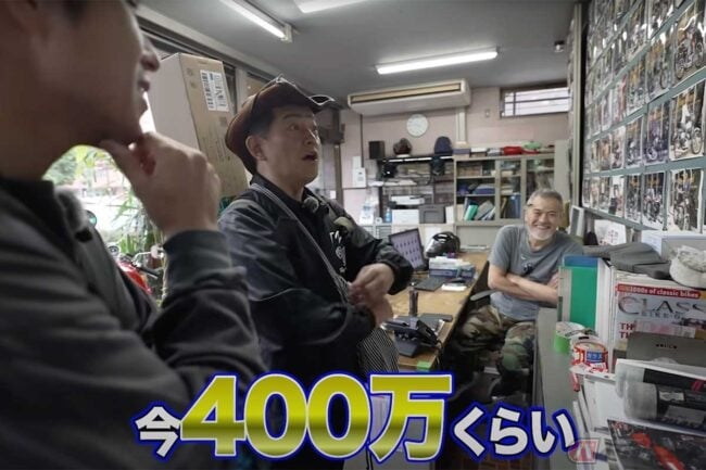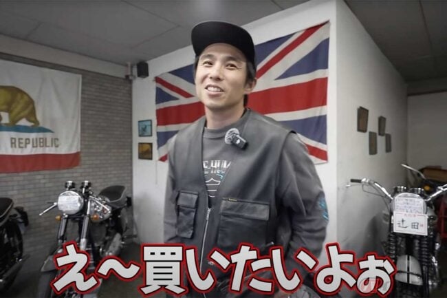 店のスタッフとの会話では、ホンダ「CB」の仕様違いや、伝説のヴィンセントについての解説が続きます。1000ccのVツインエンジンを搭載する「ブラックシャドウ」は1100万円超、500cc単気筒「コメット」との違いも紹介され、マニア心をくすぐるディープなトークが展開されました。