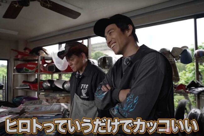 同店は中尾さんにとって、特別な場所だと言います。20歳を過ぎてすぐ、大型2輪免許を取得した直後に初めての大型バイクを購入した店なのだそうです。当時はドラマ『ROOKIES』が終わった頃で、若さが溢れていた中尾さんと愛車の写真が店内にまだ貼られており、感慨深そうに見入る場面から動画は始まります。