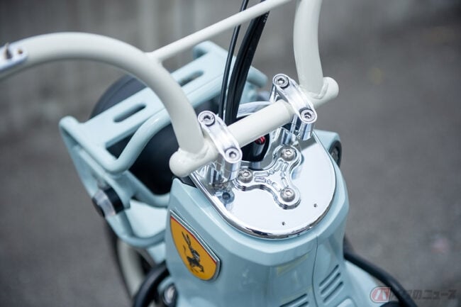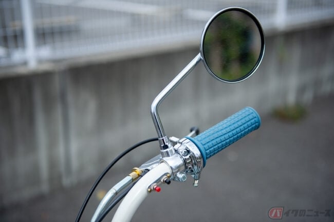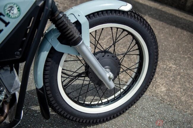 そのほか、淡いボディカラーを引き締めるべく、ブロックタイヤを装着しリムのエッジサイドをアイボリーとし、センター部はスポークと同色のブラック仕上げに。