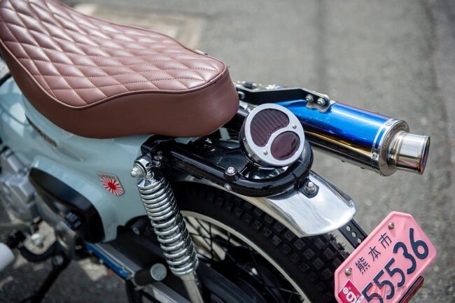 まず、スーパーカブカスタム専門店「garage works」の阿部さんが手を付けたのはリアエンド。タイヤの中心ほどまで伸びたリアフェンダーを大胆にカットし、チョッパーカスタムで使われることの多いスチールフェンダーとデュオテールランプをセットすることで、少し重い印象のあるクロスカブを軽快に魅せると共にカスタム感がグッと向上しています。