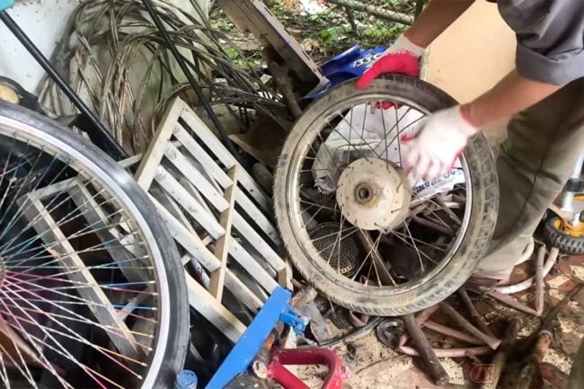 まず、動画主は廃材置き場からスプリングのサイズに合わせた小さめのビジネスバイク用のホイールをゲット。チューブとタイヤを外したらスポークをぶった切り、サビを研磨していきます。