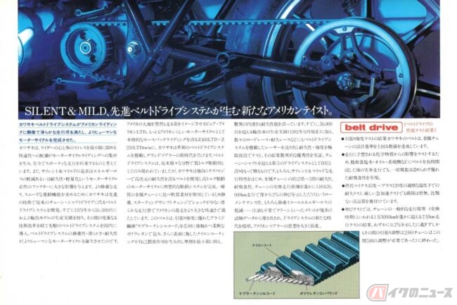 とはいえハーレー以外のメーカーがベルトドライブを全く採用しなかったワケではありません。日本メーカーではカワサキが1982年にアメリカンスタイルの「Z400LTD」(国産第1号)と「Z250LTD twin」にベルトドライブ仕様車を用意しました。じつは当時のカタログでも、最初の1ページをフルに使って、新採用のベルトドライブの優位性を語っています。