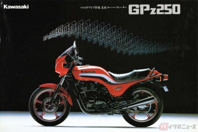 そして翌1983年にはロードスポーツの「GPz250」もベルトドライブを採用。こちらはカタログ表紙に「ベルトドライブ搭載、先鋭スーパークォーター」と書かれ、中面でもしっかり解説しています。
