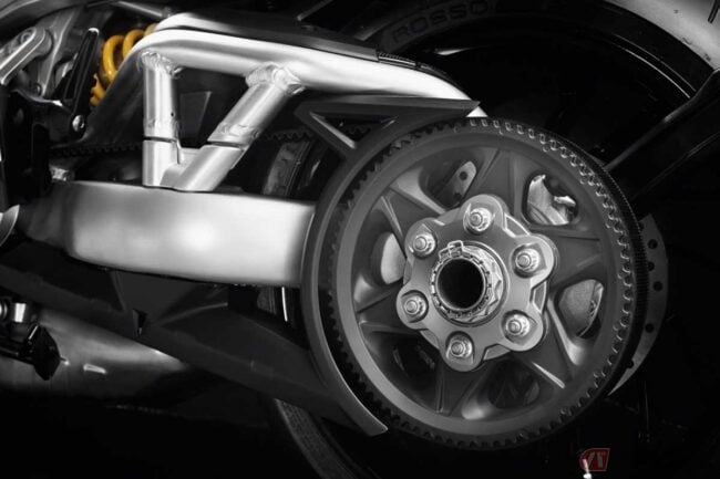 そして現行モデル(2気筒エンジン車)もベルトドライブを継続していますが、新型の4気筒エンジンを搭載した「XディアベルV4」ではチェーンドライブになっています。