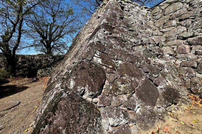 内部に入り、目を惹いたのはやはり美しい石垣です。大小の自然石を巧みに積み上げており、荒々しさと緻密さが同居しているかのような見事なバランスです。一部修復しているそうですが、その美しさに思わず見入ってしまいました。石自体は城跡でよく見る花崗岩のようです。