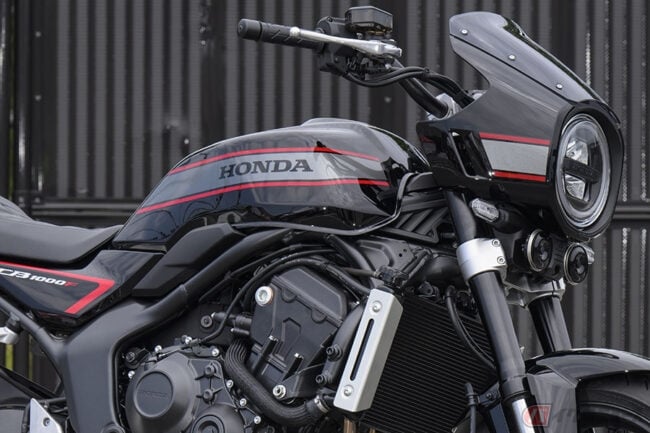 スーパースポーツモデルのエンジンをベースに、幅広いシーンで扱いやすさ、快適さを目指した排気量999cc水冷・DOHC・直列4気筒エンジンをダイヤモンドフレームに搭載するCB1000Fでは、かつて販売していた「CB750F」(1979年)のフューエルタンクからサイドカバーを経てリアカウルに繋がる伸びやかなラインと、スムーズに連続する一体的なデザインをモチーフした外観に仕上げられています。