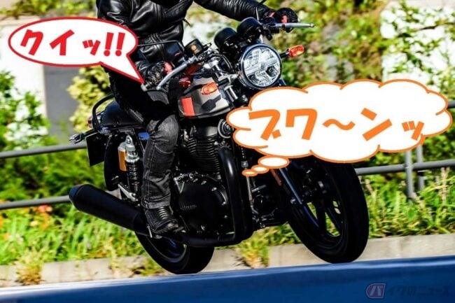 たとえば5速で走っていれば、エンジン回転数は約3000rpmですが、4速だと約3500rpmです。ということは、5速から4速にシフトダウンすると、約500rpmの回転差があります。このシフトダウンを「回転合わせナシ」で行うと、後輪の回転数とエンジン回転数がマッチしないため、一瞬エンジンブレーキが強く効いてしまい、ガクッと車体が揺れてショックが発生します。