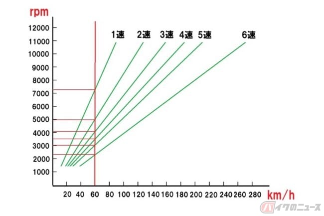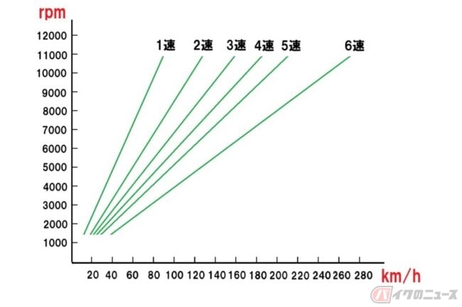 そこでカワサキ「Z900RS」の変速比のグラフを作ってみました(スペック表の数値をベースに計算しているので完全に正確ではない)。縦軸がエンジンの回転数で、横軸が走行スピードです。空気抵抗や路面の走行抵抗などが加味されないので、けっこうスピードが高めですが、そこは無視してください。ここで大事なのは、各ギアでのスピードとエンジン回転数の関係です。