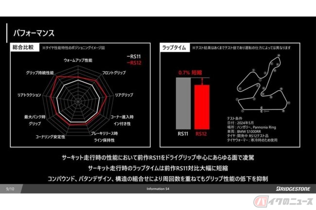 同社は、従来品「BATTLAX RACING STREET RS11」と比べてラップタイムを大幅に短縮し、サーキット走行での総合性能が全方位で向上したとしています。ドライ路面でのスポーティな走行からワインディング、サーキットまで幅広く対応できるタイヤです。