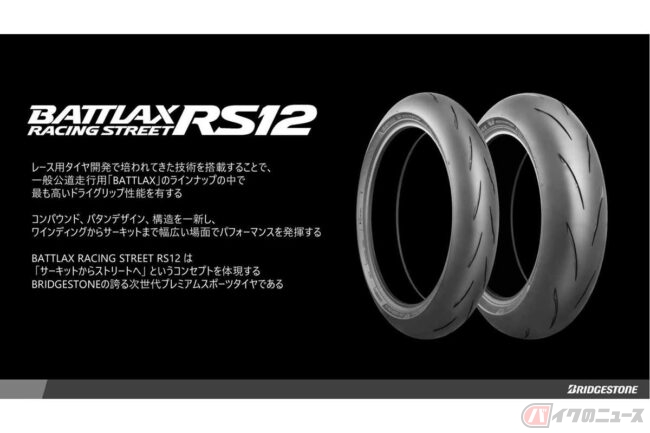 ブリヂストンは、モーターサイクル用新タイヤ「BATTLAX RACING STREET RS12」を発売すると発表しました。レース技術を応用し、シリーズ最高のドライグリップ性能を実現したとのことです。