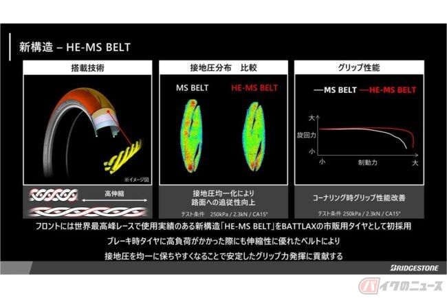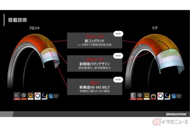 最大の進化点は、フロントタイヤに世界最高峰レースで使用実績のある新構造「HE-MS BELT」を市販用タイヤとして初めて採用したことです。伸縮性に優れたベルトにより接地圧を均一化し、グリップ力を強化しています。
