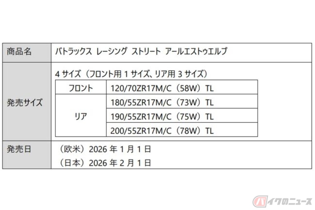 RS12の発売サイズはフロント1種(120/70ZR17M/C)とリア3種(180/55ZR17M/C、190/55ZR17M/C、200/55ZR17M/C)の計4サイズです。欧米では2026年1月1日、日本では同年2月1日に発売予定です。