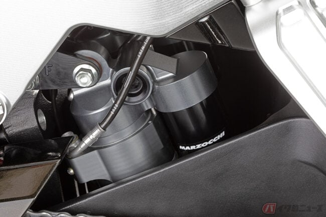 また、標準装備のオーリンズ製TTXサスペンションのほか、海外仕様ではオプションとして、よりストローク量の長いマルゾッキ製セミアクティブサスペンションシステム(ノーマルの114mmに対して145mmまで増加)も用意されています。