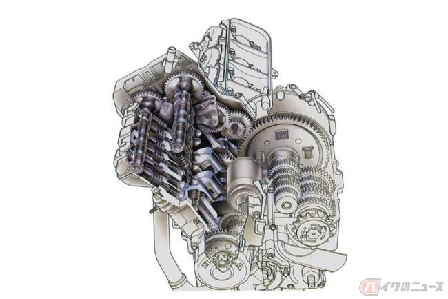 ちなみに、1992年にはかつてのワークスマシンに採用した「楕円ピストン」の集大成とも言える、排気量750ccクラスのV型4気筒楕円ピストンエンジンの「NR」もカムギアトレーン方式です。