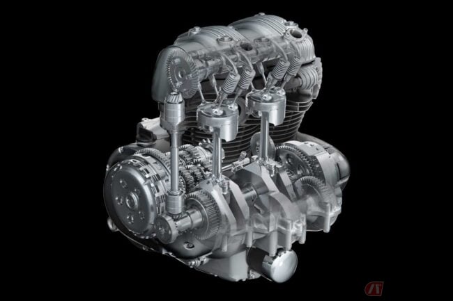 そこでトラディショナルな空冷2気筒エンジンに、カムチェーン方式ではなく敢えてカムギアトレーン方式を採用しました。シリンダーの右側面に、カムシャフトを駆動するベベルギアのシャフトトンネルとギアカバーを設けることで、既存の空冷2気筒とは異なる意匠を凝らしたワケです。