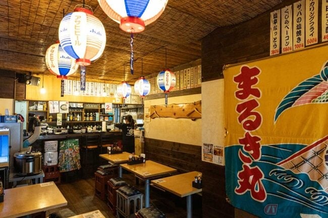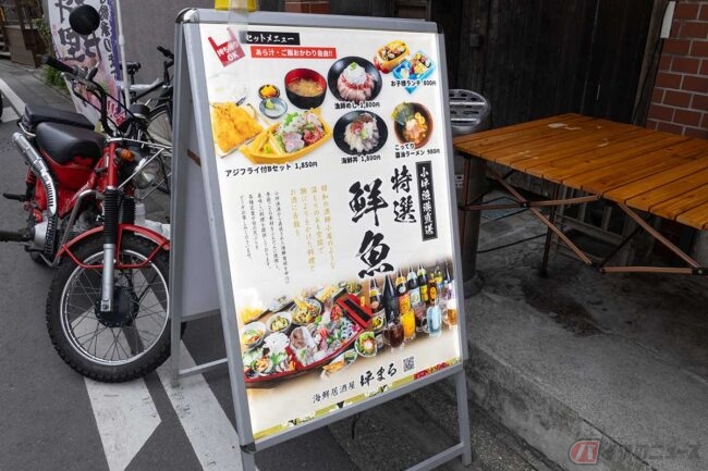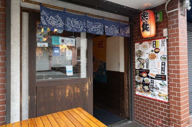 というわけで、小坪漁港のすぐ近くにある「海鮮居酒屋 坪まる」に到着です。外に置いてある看板にアジフライの写真がどーんと出ていて期待しかありません。
