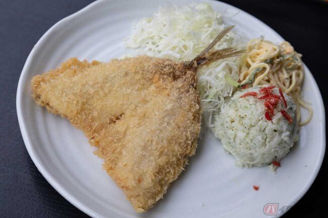 まずはアジフライからいただきます。サクッとした歯応えにふわっとした食感で、アジフライの王道という感じです。旨みのある美味しい鯵で、厚みとボリュームがあります。