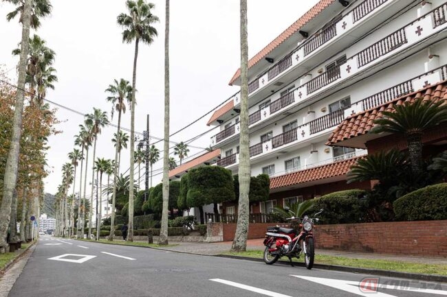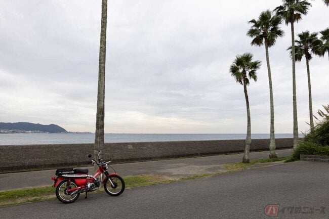 美味しいアジフライを求めて、筆者(増井貴光)がやって来たのは神奈川県逗子市です。逗子の映えスポットと言えば、やっぱり逗子マリーナです。カリフォルニアっぽい椰子の木をバックに愛車のホンダ「CT110」を撮ってツーリング気分が盛り上がります。