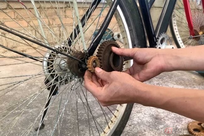 動画主はジャンクの中からサビだらけの歯車(ギア)を複数個取り出して並べ、それをチェーンの代わりにペダルの回転を後輪に伝えようと考えたようです。