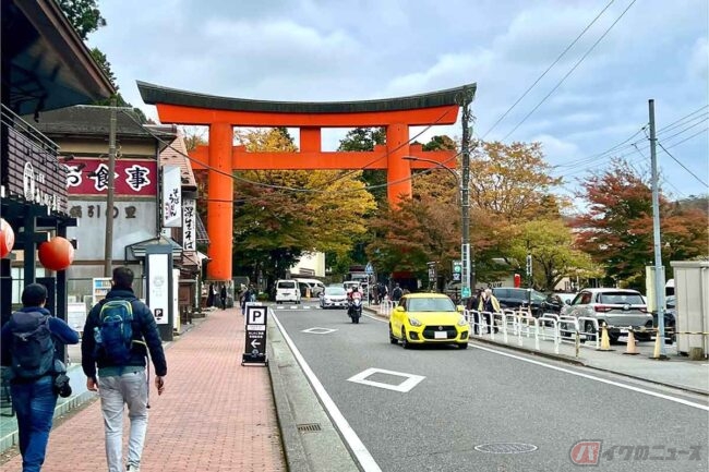 お腹も満たされたところで、紅葉と食後のコーヒーを楽しむべく、すぐ近くの恩賜箱根公園へ。入口は自動車用ゲート左の通路で、入ってすぐ横が駐輪スペースです。