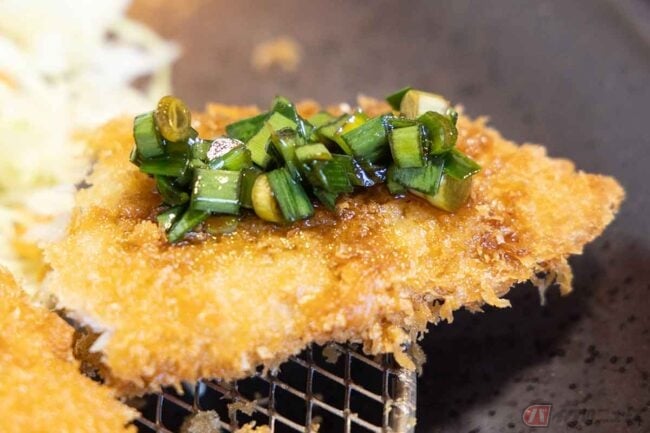 次は「特製ニラソース」でアジフライをいただきます。ウムム、これは美味しい! 醤油とオイスターソースなどで作ったソースに刻んだニラがたっぷり入っています。テーブルにはソースが置いてあり、お願いすればタルタルも付けてもらえるようですが、「特製ニラソース」が抜群に美味しいです。ご飯を何杯でも食べられそうなアジフライにランクアップしました。
