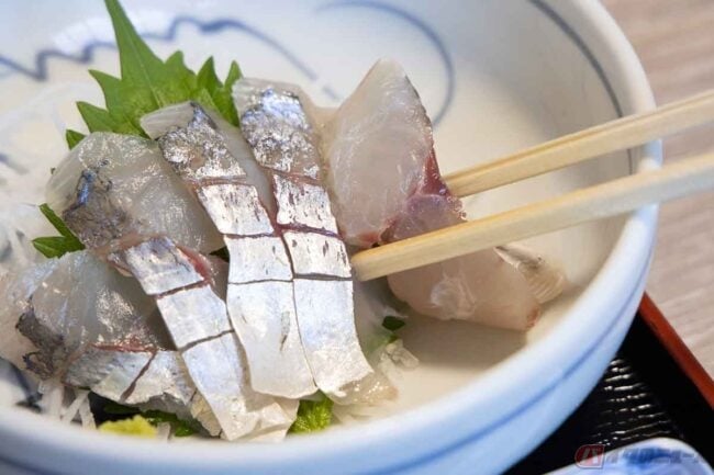 「釣りアジの刺身」は適度に脂がのっていて弾力があり、新鮮でむちゃくちゃ美味しい! 「釣りアジのアジフライ」が食べられなかったのは残念ですが、十分に釣りアジの味を堪能しました。