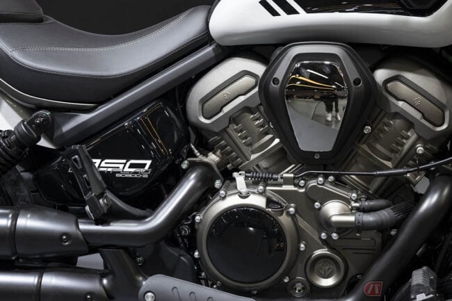 最高出力108馬力(80kW)/9000rpm、最大85Nm/8000rpmのトルクを発生する新開発の自社製948cc V4エンジンを搭載するDark Flag 950は、ベンダ初のニア・リッタークラスのクルーザーモデルです。