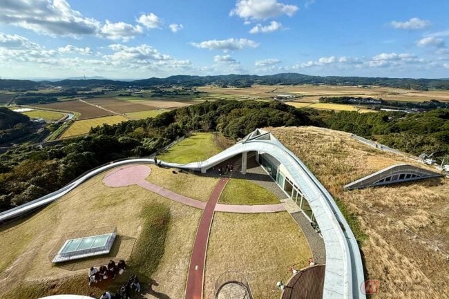 ここでは壱岐についてじっくり学ぶことができます。黒川紀章が手がけた最後の建築作品でもあり、外観も見応え抜群。建物の上部には広々とした屋上があり、長崎県で2番目に広い平野「深江田原(ふかえたばる)」に復元された、原の辻遺跡の集落が一望できます。