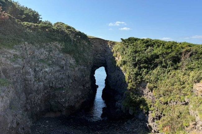 壱岐島の海岸線では、自然がつくり出したダイナミックな造形美に次々と出会えます。北部の「鬼の足跡」では、岩のトンネル越しに海と空が額縁のように切り取られ、草原の丘と紺碧の海が鮮烈なコントラストを描きます。