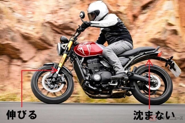 先に答えを言ってしまうと「アクセルを開けてもリアは沈みません」。じつはアクセルを開けて加速すると、フロントフォークが伸びて「前上がり」になるため、相対的にリアが沈んだように感じるだけなのです。