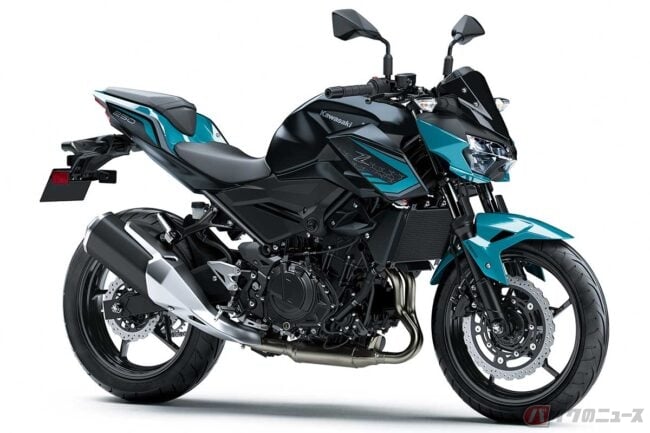 その姿はネイキッドスタイルの軽快なボディに、スポーティな走行性能を融合させた排気量250ccクラスのロードスポーツモデル、カワサキ「Z250」の2021年モデルに設定されていた「パールナイトシェードティール×メタリックフラットスパークブラック」を彷彿とさせる配色と言えそうです。