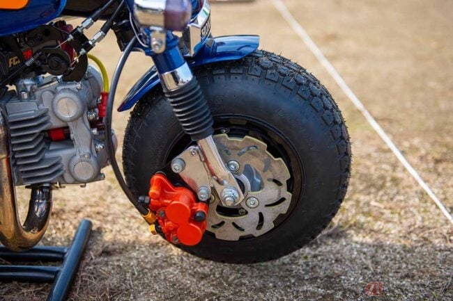 足回りは前後共に4.10/3.50-6のムチムチタイヤに同じく前後ディスクブレーキに換装。フロントはダブルディスクと先のパワートレインでも制動性はバッチリ。スペックの凄さに目が行きますが、ディスクローターとホイール径がほとんど変わらないという面白さも秘めています。