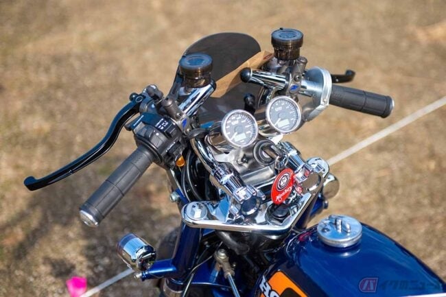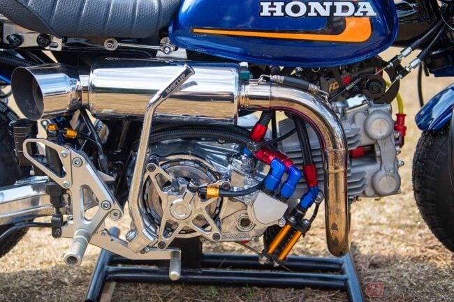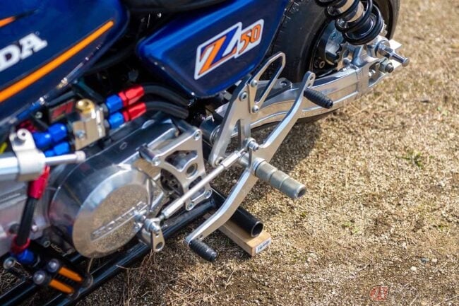 ではカスタム内容を見てみましょう。エンジンは腰上がデイトナ製のDOHCヘッド、腰下は武川製の乾式クラッチユニットで仕上げ、キャブレーターにFCR28、アップマフラーを備えるなど、小さい車体の中にキッチリと作り込まれたパワートレインが搭載されています。