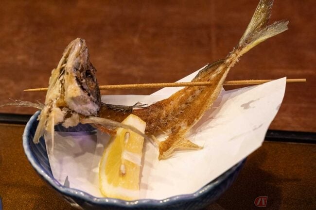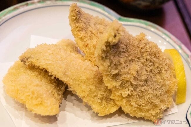 アジフライはなかなかの大きさで厚みもあります。細かめのパン粉に揚げ色薄め、サクサク食感の揚げ具合。身はふんわりですが旨みが強いです。天草産の活きた鯵を捌いて揚げているということもあって、これがまた美味しい。しかも大きい。骨せんべいも美味しいです。