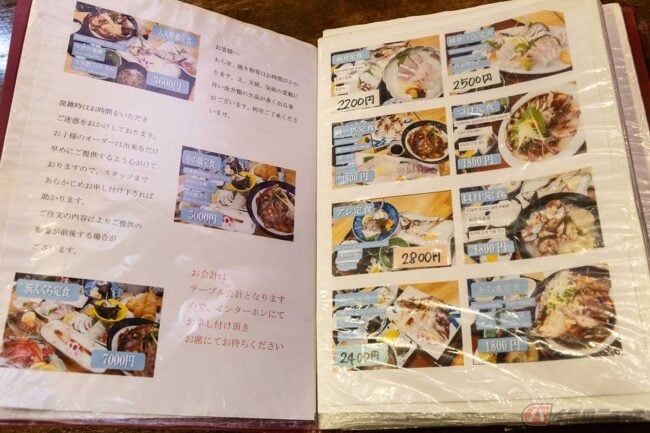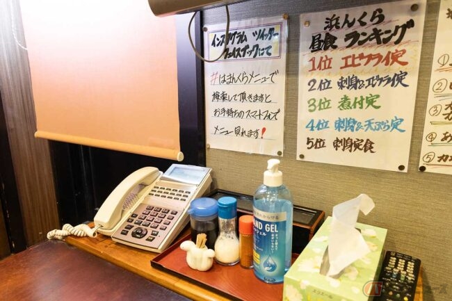 店内は個室に分かれていて、そのひとつに通されました。メニューを見ると海鮮丼から刺身やフライの定食などのほか、とんかつや焼肉の定食もあります。その中に「アジフライ定食」もあったので速攻オーダーしますが、テーブルに置いてある電話で伝えるシステムです。