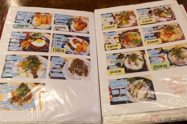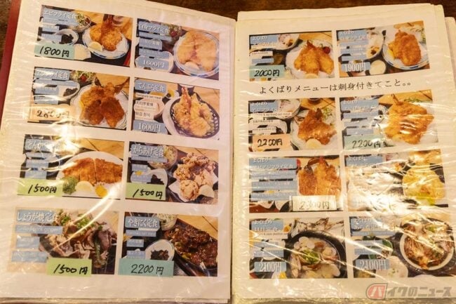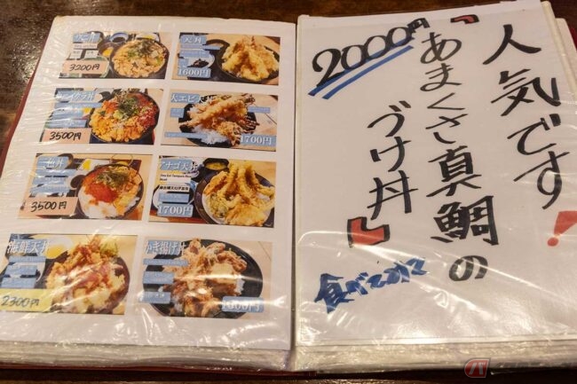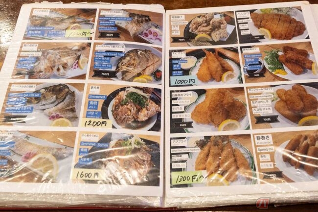 メニューには刺身とセットになった「よくばりアジフライ定食」や「よくばりエビアジフライ定食」もありました。壁に貼られた昼食ランキングでは「エビフライ定食」が1位でした。メニュー写真では開いたエビフライで、こちらも美味しそうです。なんてことを思っているうちに「アジフライ定食」が出来上がってきました。