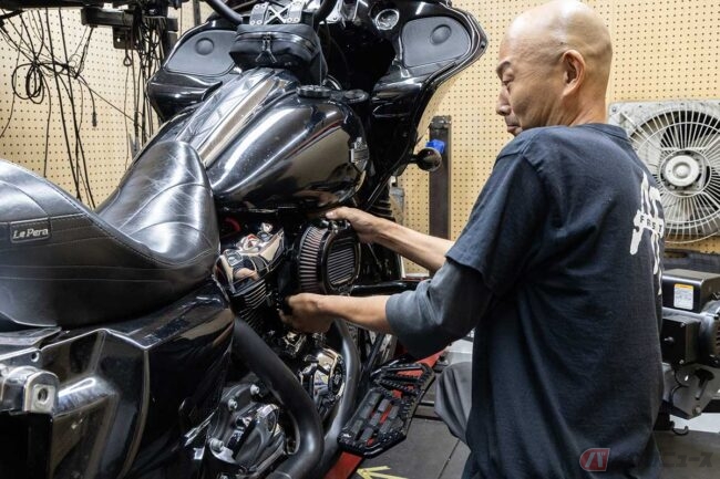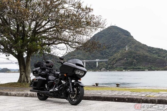 エンジンまわりをいろいろやってもらった「ロードグライド」は絶好調です。重量級の車体が見違えるように軽々と加速し、目的の観光スポット「長部田海床路(ながべたかいしょうろ)」に陽があるうちに到着しました。