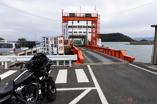 短いフェリーに乗るのも九州ツーリングの楽しみのひとつ。さて、次はどこで美味しいアジフライが食べられるのでしょうか。