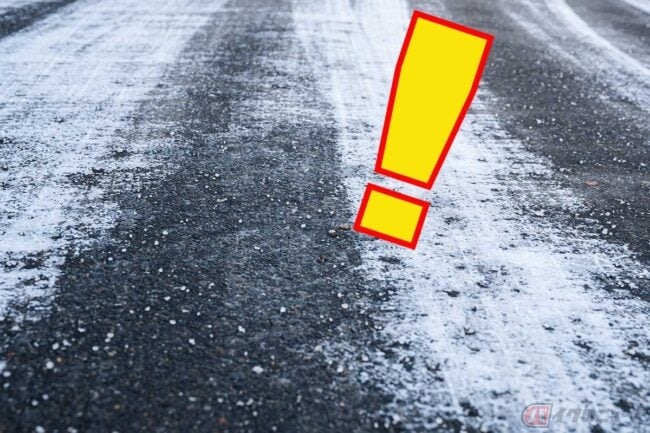 ところが雪や氷に反応すると溶けて水になってしまうため、通常の濡れた路面と見分けがつかなくなります。なので気温が低い日や降雪、凍結の予報が出ている日は「融雪剤や凍結防止剤が撒かれている前提」で、速度を落として慎重に走ることが大切です。