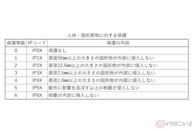 ちなみに、防塵性能だけを表す場合は「IP(数字)X」、防水性能だけを表すときは「IPX(数字)」のように、表記しない保護特性を「X」で記します。