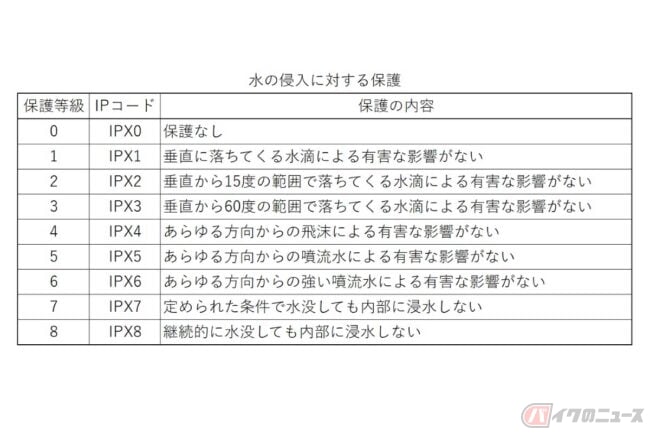 しかし「IP5X」と「IP6X」は「粉塵」に対する保護性能なので、これはバイクだと重要な指標になり、少なくともどちらかをクリアしている機器が安心です。