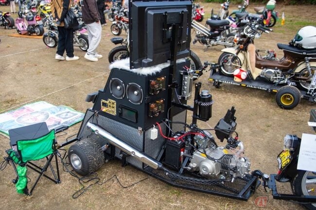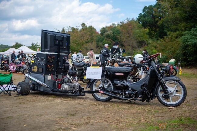ホンダ「スーパーカブ」+「トレーラー」で注目度バツグン!! “モニター”に“ウーファー”、“プレステII”に“ダンレボ”も!? エンタメを極めた異色のカスタムに迫る!!
