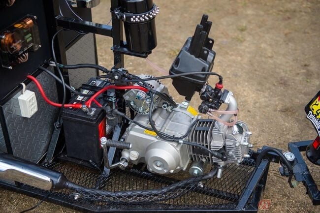 それら電子機器の裏側にはカブ系横型エンジンが搭載されており、スプロケットからチェーンを通じて自動車用のジェネレーター(発電機)を回して電力供給しているんです。