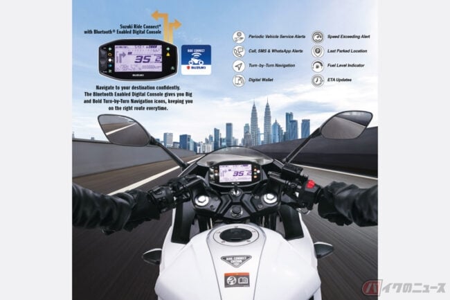 装備面では、ワンプッシュでエンジン始動が可能なスズキイージースタートシステムを採用。軽量で多機能なインストルメントパネルはフル液晶ディスプレイで、バータイプのタコメーターやデジタルスピードメーター、ギヤポジションインジケーター、燃料計、時計など多彩な情報をわかりやすく表示します。